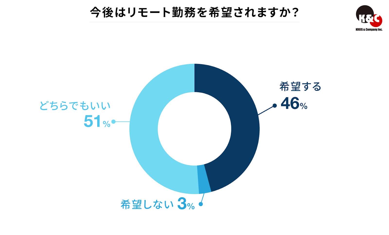 今後の働き方についてたずねると、「どちらでもいい」が51%で最多となりました。続いて「リモート希望」は46%、「リモートを希望しない」は3%です。フルリモートや週5出社といった固定化よりも、「仕事に合わせて最適な働き方を選びたい」といった志向がうかがえる結果になりました。
